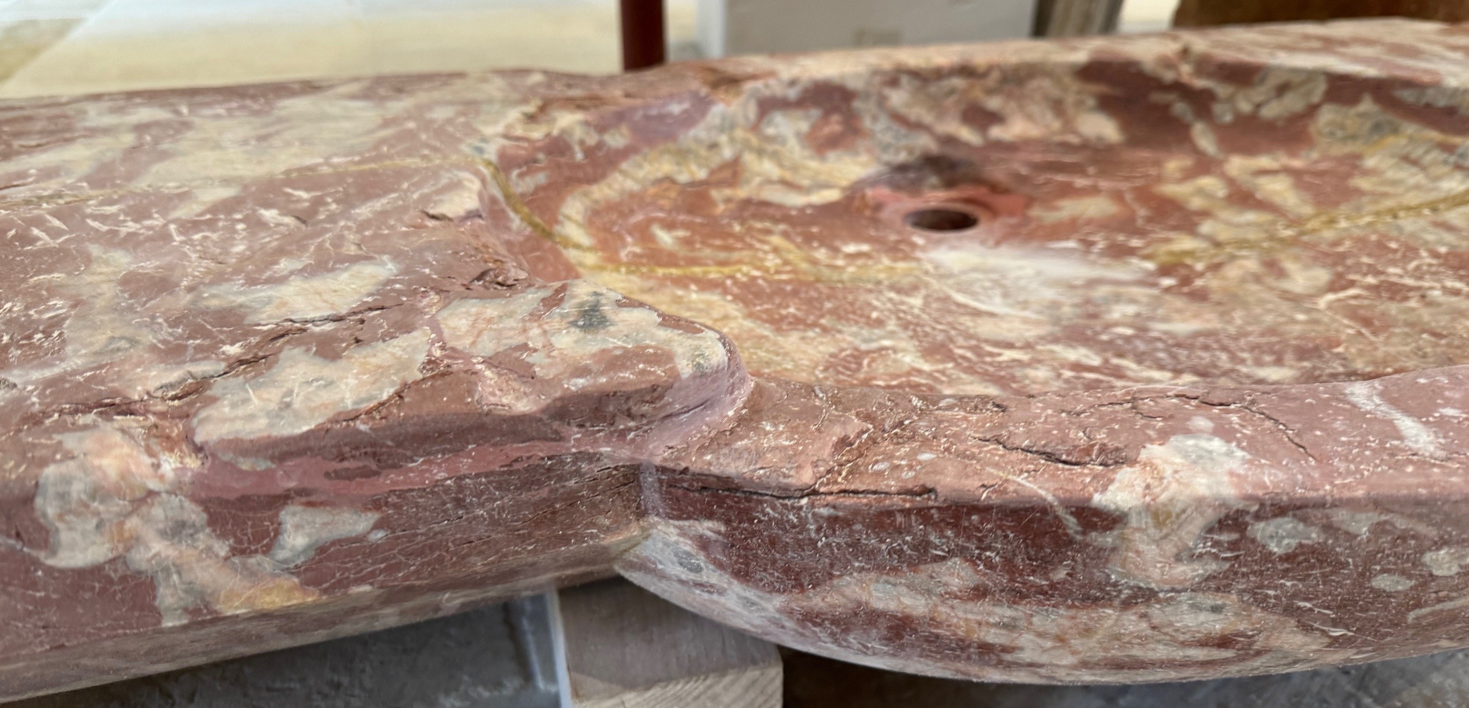 L’évier en marbre rouge, également connu sous le nom de marbre du roi ; ce marbre se distingue par sa couleur riche et ses veines caractéristiques, ce qui en faisait un matériau idéal pour les maisons bourgeoises de l’époque.