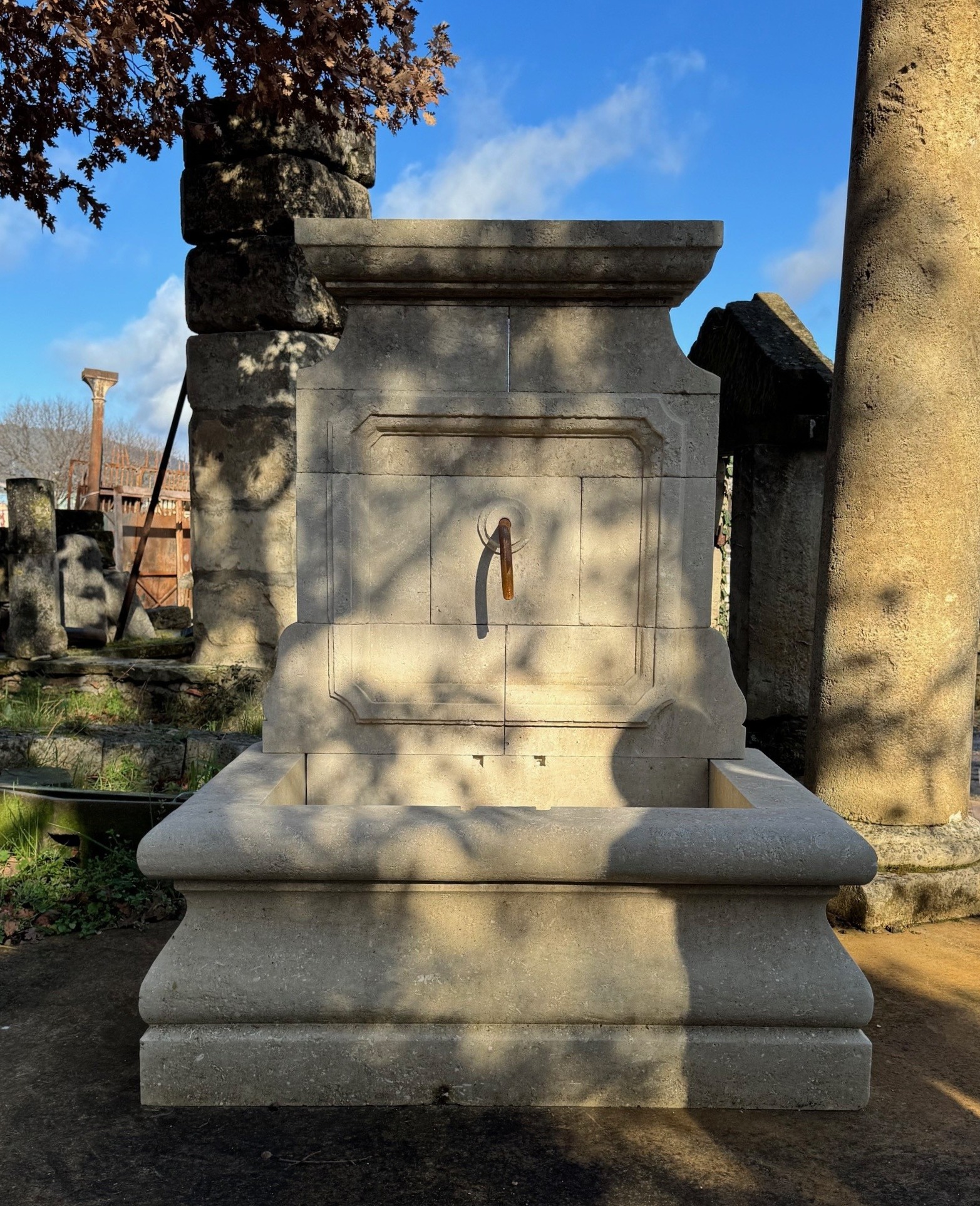 Fontaine de style Louis XIV, taillée dans notre atelier de taille de pierre, avec un fronton évidé, orné de moulures dans la masse.
